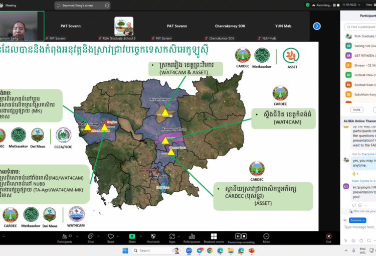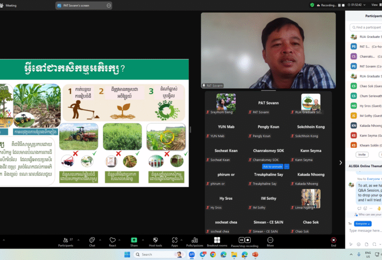 On July 10, 2024, ALiSEA in Cambodia organized the online thematic workshop (webinar) via Zoom Meeting under the topic “Conservation Agriculture (CA)”. This webinar aimed to to provided valuable insights and actionable knowledge for enhancing agricultural performance related to the benefits of cover crops, soil health (carbon), principles of Conservation Agriculture, and Conservation Agriculture in Agroecology. 30 participants ( 10 Females), representing 25 organizations, comprising ALiSEA members, non-members, and partners were actively participated in this.