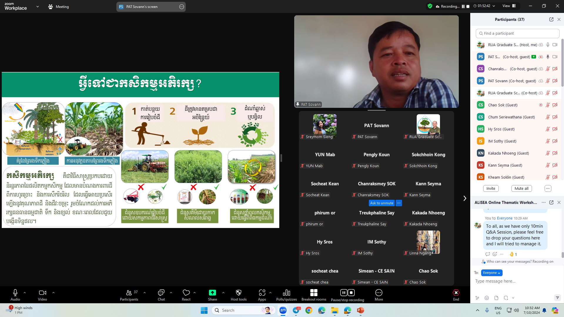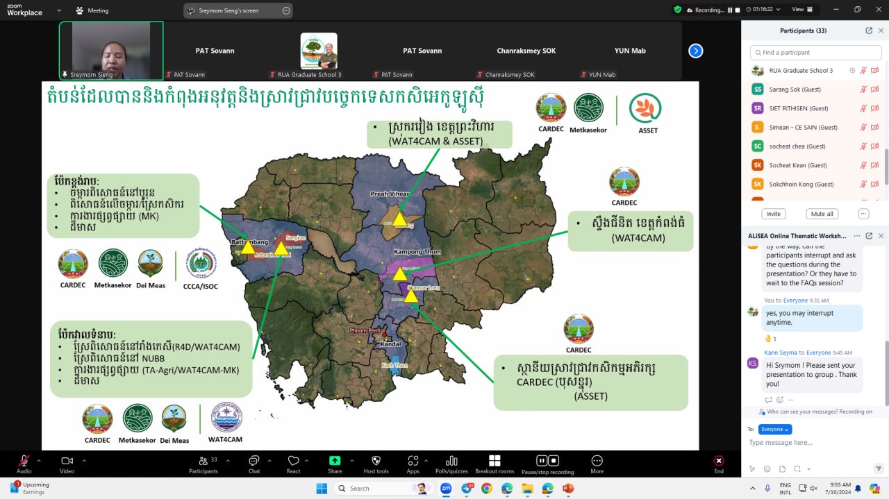 On July 10, 2024, ALiSEA in Cambodia organized the online thematic workshop (webinar) via Zoom Meeting under the topic “Conservation Agriculture (CA)”. This webinar aimed to to provided valuable insights and actionable knowledge for enhancing agricultural performance related to the benefits of cover crops, soil health (carbon), principles of Conservation Agriculture, and Conservation Agriculture in Agroecology. 30 participants ( 10 Females), representing 25 organizations, comprising ALiSEA members, non-members, and partners were actively participated in this.