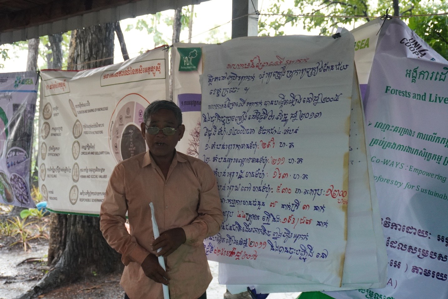 The community leader presented about their initiatives, providing a detailed account of the community’s history and organizational structure. Established in 2005 and legally registered in 2013, the Ou Kak community encompasses a total land area of 1,200 hectares, divided into four critical areas. It comprises a committee of seven members, including three women. Meanwhile, 77 households amounting to 193 individuals (87 female) are members. The community is the Pu Nong indigenous group.