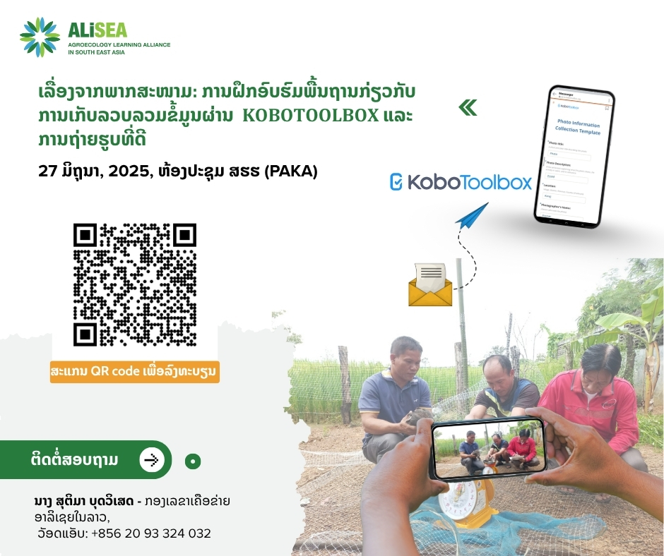 ເຊີນເຂົ້າຮ່ວມຝຶກອົບຮົມກັບພວກເຮົາ ໃນຫົວຂໍ້ KOBOtoolbox ແລະ ການຖ່າຍຮູບໃນພາກສະໜາມ ສໍາລັບສະມາຊິກ ALiSEA ໃນລາວ ເພື່ອເພີ່ມທັກສະໃນການເກັບຂໍ້ມູນຂອງທ່ານ ແລະ ບອກເລື່ອງລາວຈາກພາກສະໜາມຜ່ານຮູບພາບທີ່ມີຄວາມໝາຍ.