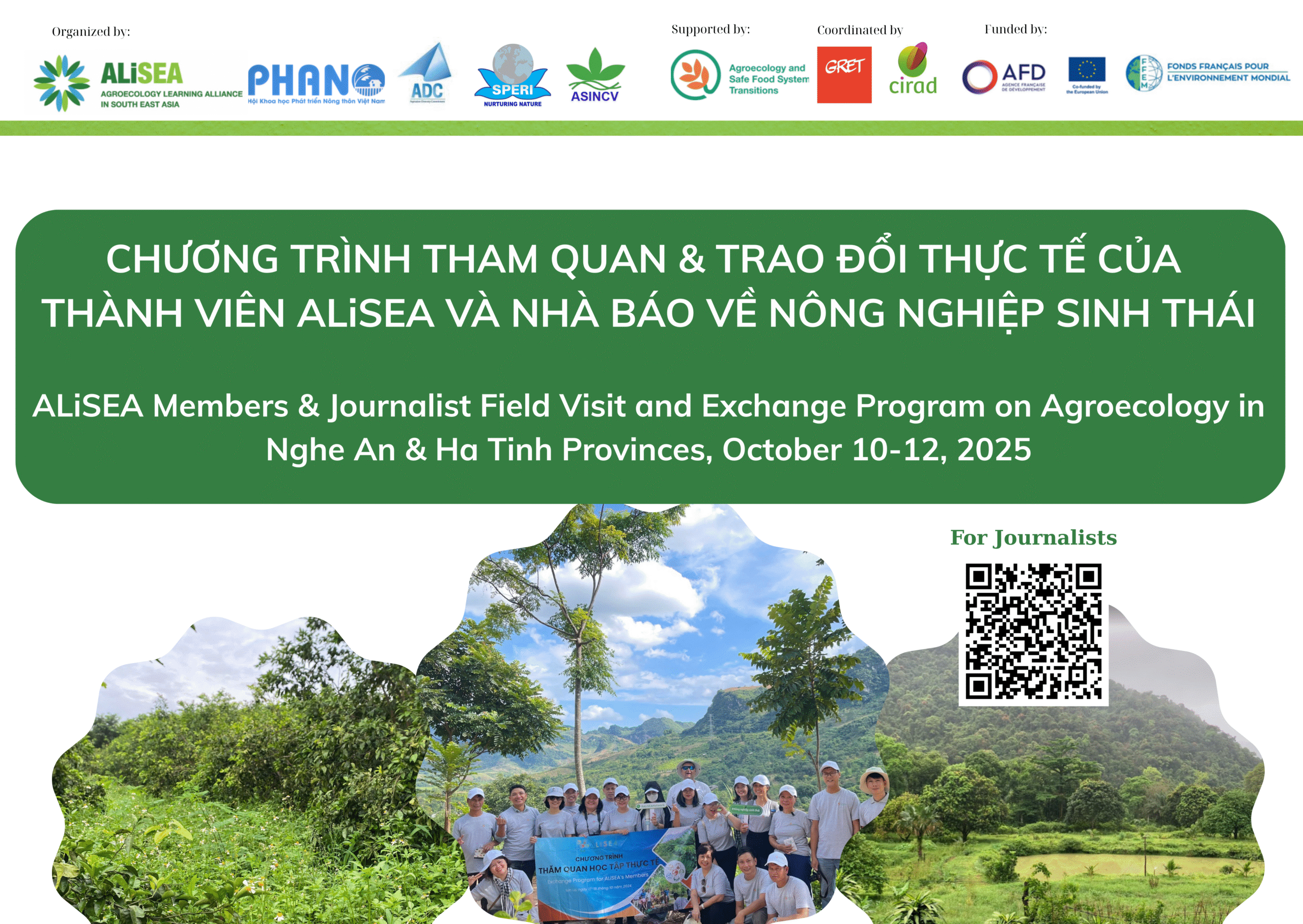 Từ 10–12/10/2025, ALiSEA sẽ tổ chức chương trình tham quan và trao đổi tại tỉnh Nghệ An và Hà Tĩnh. Sự kiện sẽ kết nối thành viên ALiSEA, nhà báo, nông dân và chuyên gia để tìm hiểu về thực hành nông nghiệp sinh thái, chia sẻ kinh nghiệm và thúc đẩy hợp tác. Người tham gia sẽ được thăm quan các mô hình thực tiễn thành công, giao lưu với các nhà thực hành, đồng thời phát triển những câu chuyện truyền thông sinh động về nông nghiệp sinh thái.