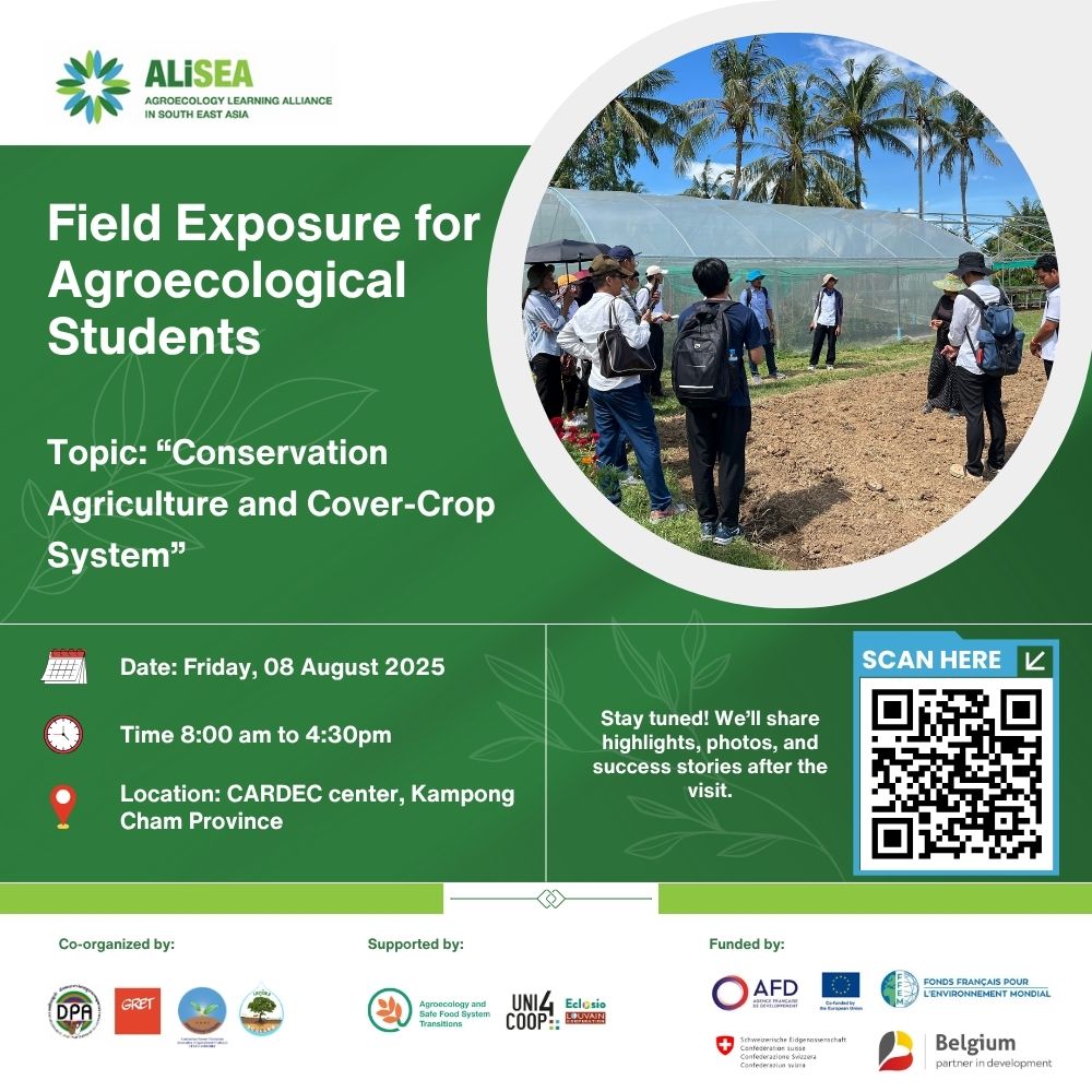 ALiSEA Cambodia is planning to organize the Field Exposure for Agroecological Students from National University of Battambang to deepen their understanding on the cover crop system and conservation agriculture toward the scientific and practical aspects beyond the theoretical classes. This field visit is scheduled on Friday, 08th August 2025 to Cambodian Conservation Agriculture Research for Development Center, Bos Knor, Chamka Lue District, Kampong Cham Province.