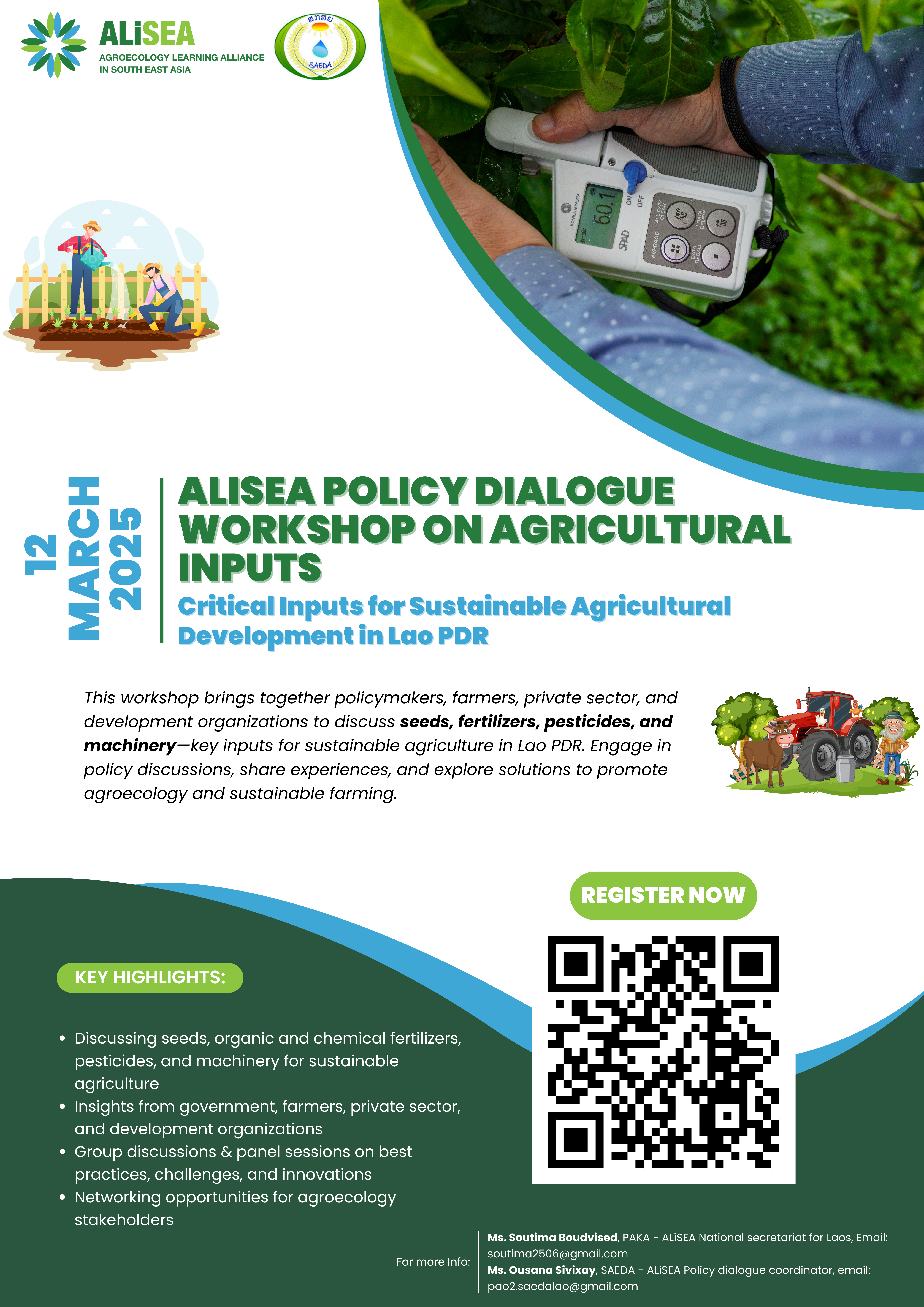 This workshop brings together policymakers, farmers, private sector, and development organizations to discuss seeds, fertilizers, pesticides, and machinery—key inputs for sustainable agriculture in Lao PDR. Engage in policy discussions, share experiences, and explore solutions to promote agroecology and sustainable farming.