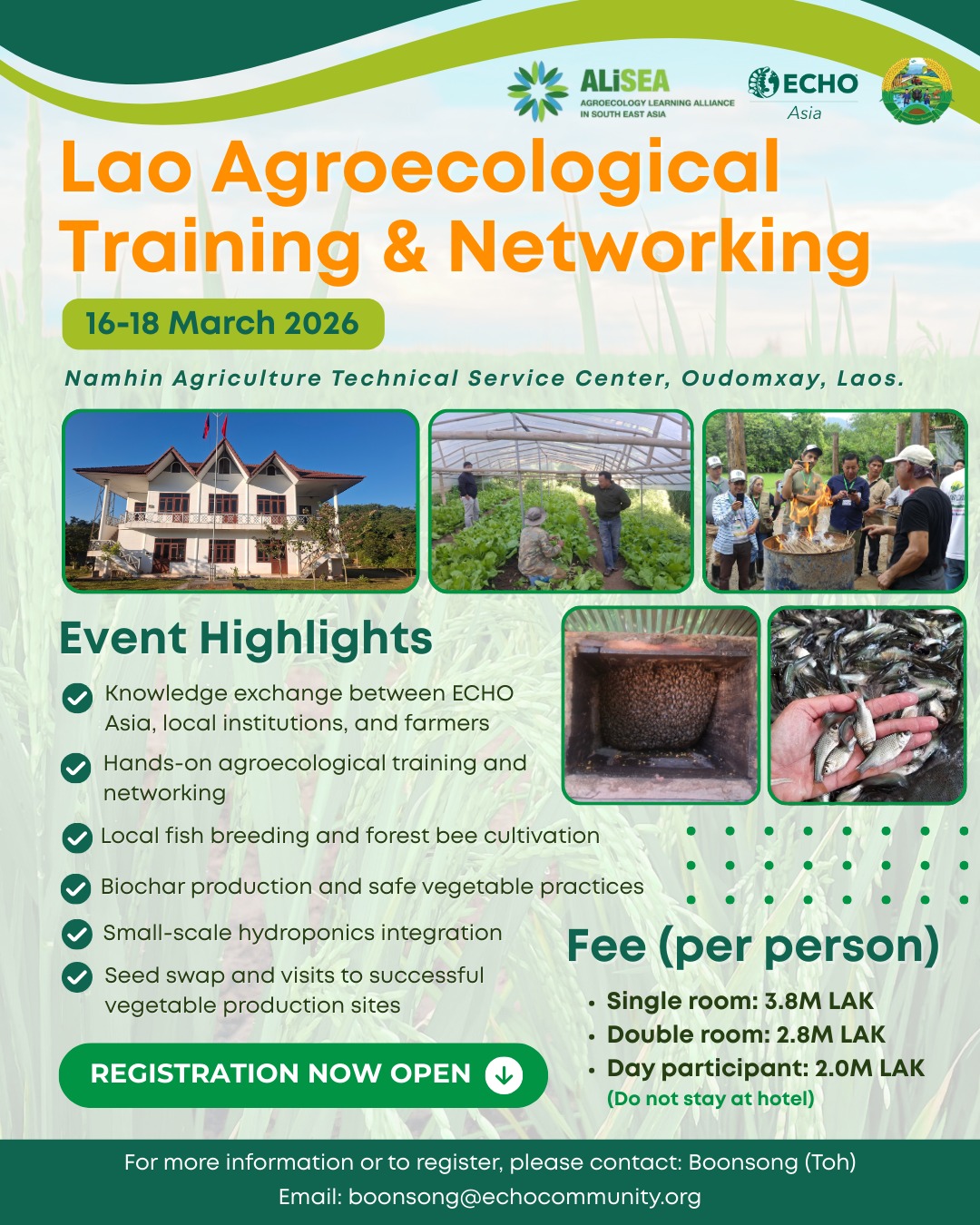 The Lao Agroecological Training & Networking will take place from 16–18 March 2026 at the Namhin Agriculture Technical Service Center, Oudomxay, Laos. Organized in collaboration with ALiSEA and ECHO Asia, this event brings together farmers, practitioners, and local institutions to strengthen agroecological knowledge and collaboration in Laos.