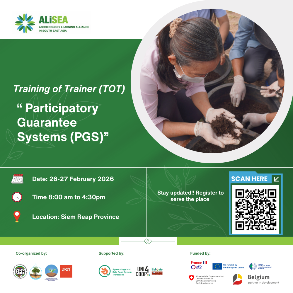 ALiSEA Cambodia is planning to organize the “Training of Trainers (ToT) on Participatory Guarantee Systems (PGS)”. The objective of this training is to share practical experiences on PGS to support producer groups of agroecology products.