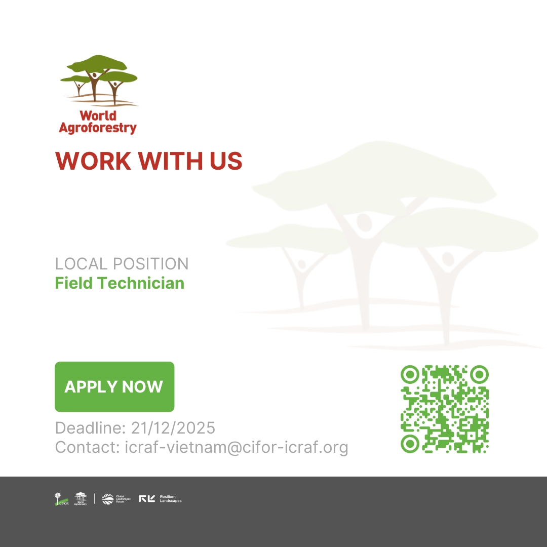ICRAF Viet Nam country office is seeking a dynamic, motivated field technician to carry out field project activities and provide on-site technical support to local farmer cooperators in the assigned location of Phinh Ho and Hanh Phuc communes, Lao Cai province. The post holder is also required to establish and maintain close collaboration with local agencies and partners in communes.