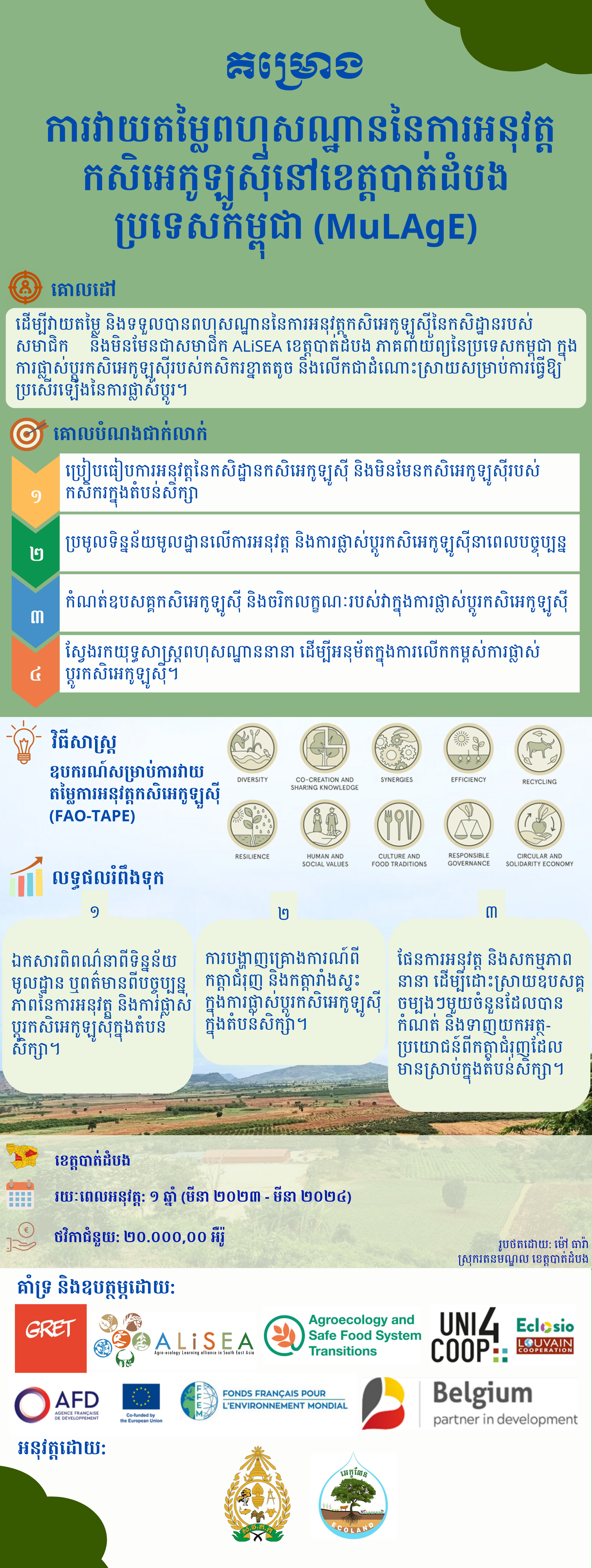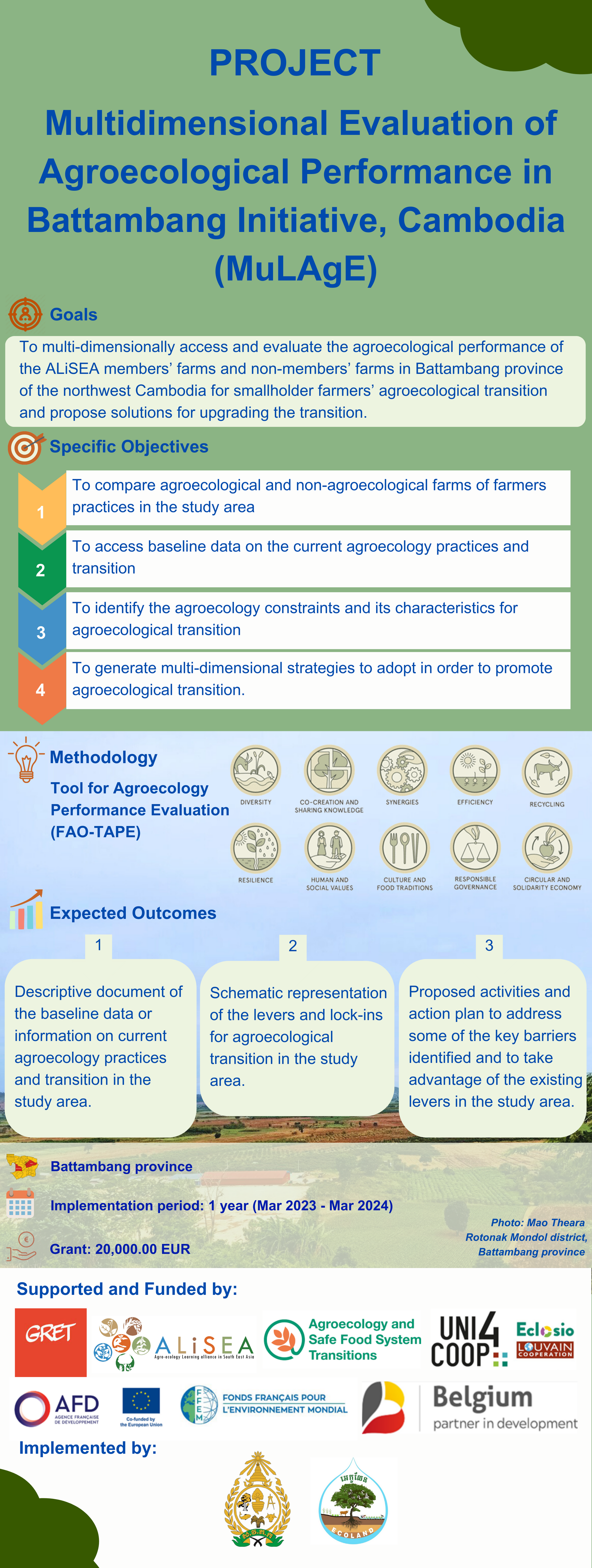 Recent efforts led by development stakeholders focus on enhancing the sustainability of Cambodian agriculture. The regional network ALiSEA focuses on helping vulnerable farmers to transition towards sustainable agriculture practices through networking, strengthening knowledge, sharing experience, increasing the visibility of agroecology, and scaling-up the adoption of agroecological practices among farmers. This study aims to evaluate existing ALiSEA members’ farms in Preah Vihear province of northern Cambodia, promoting sustainable development using FAO-TAPE tool. The evaluation will address the agroecology profile and development criteria, including a participatory process for qualitative and quantitative aspects of the project. The project will provide evidence-based evaluation documentation and will broaden the partnerships and collaborations of ALiSEA members and non-members, promoting shared pathways to agroecological and safe food system transitions in the Sub-Mekong Region.